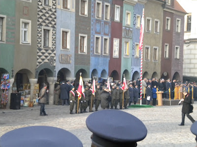 The Polish Air Force knew something about the weather that we didn’t.  The morning fog never burned off and the bad weather scheduled to arrive Friday got here this afternoon.  The fly-by was moved up an hour because of an expected decrease in visibility.  We saw and heard them zoom by as we were walking into town.  We arrived in the rynek during the speech by the American Ambassador.  He mentioned that Poland is flying the newest F-16s in Europe and something nice about our countries being allies.