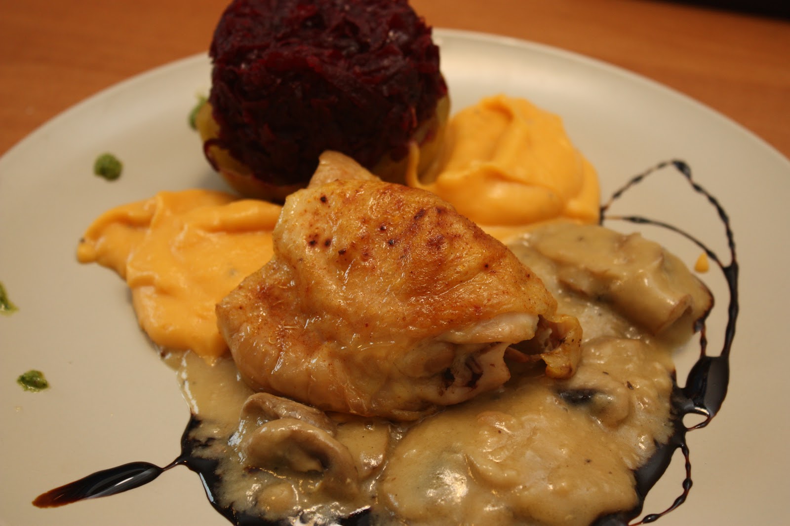 Protein – in this case, I have roast chicken and mushroom gravy. The chef served the same gravy with sliced of pork tenderloin. For vegetarians, consider one of these quinoa options.