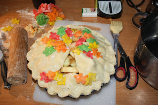 - Add the top crust, and cut out the tree trunk, I started with a sharp knife, but switched to scissors