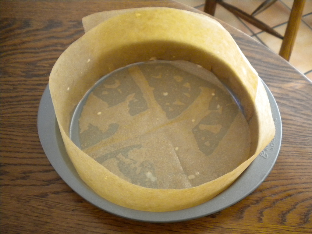 The cake batter consists of cocoa, sour cream, eggs, and vanilla combined with cake flour, sugar, baking powder, baking soda, salt and butter. It’s baked in a 9 x 2 pan. I don’t have a 9 x 2, as my previous overflow can attest, so I made a parchment collar for my pan.