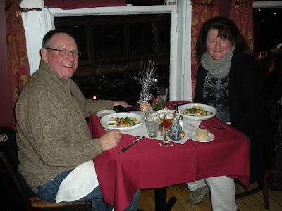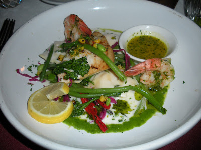 Back to Cafe Roka, we both ordered the special, a four course meal consisting of, a black-eyed pea and kale soup (perfect since it was New Year’s Day), a salad with a basil vinaigrette, sorbet, and sea bass served with shrimp, lobster ravioli and grilled vegetables. As I recall, the price was about $20.
