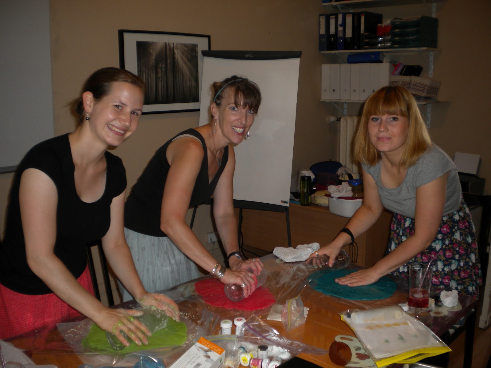 I spent yesterday morning with the kitchen staff at Sweet Surrender. It was time for our second cake workshop. We tackled fondant and modeling chocolate. In spite of my less than perfect fondant making, these ladies created beautiful cakes.