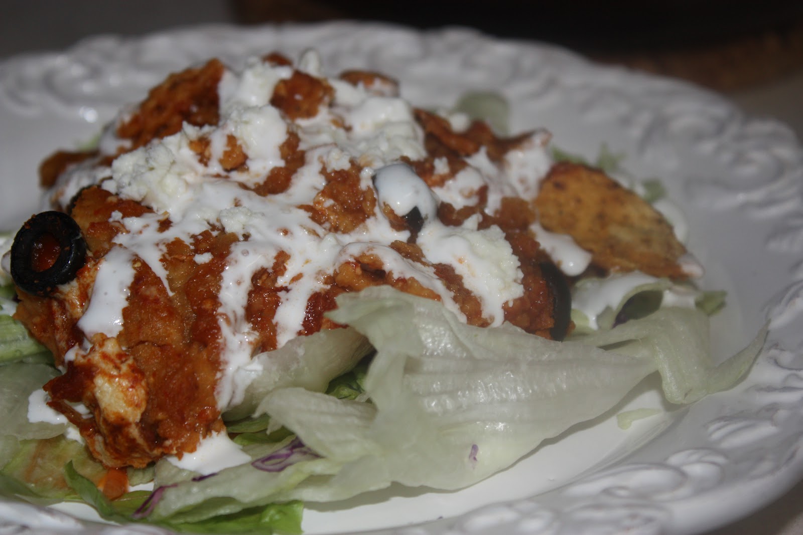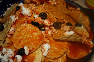 - Fill casserole dish (I used a 9 x 3 round) 1/3 full with chips, top with 1/3 of olives, and crumble 1/3 of cheese over the top.