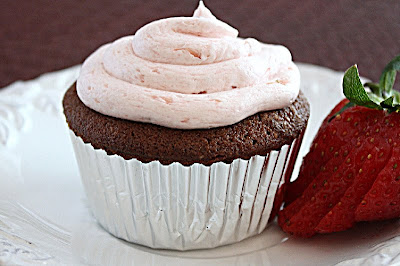 My mistake aside, these cupcakes were easy to make, the chocolate flavor was wonderful. I couldn’t leave them plain; in my book, cake is a frosting delivery system. I made my creamy vanilla frosting. The first step in this frosting is to heat milk and flour; I added a pint of finely diced strawberries to the milk and a few drops of red food coloring. I reduced the milk by 1/2 c. to make up for the moisture in the berries. The rest went according to the recipe.