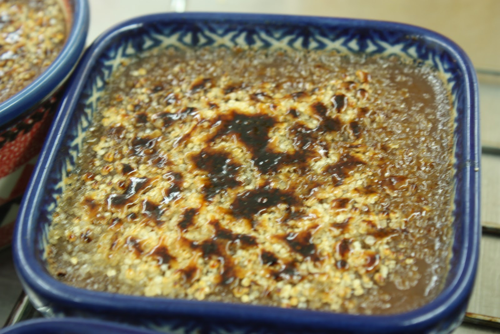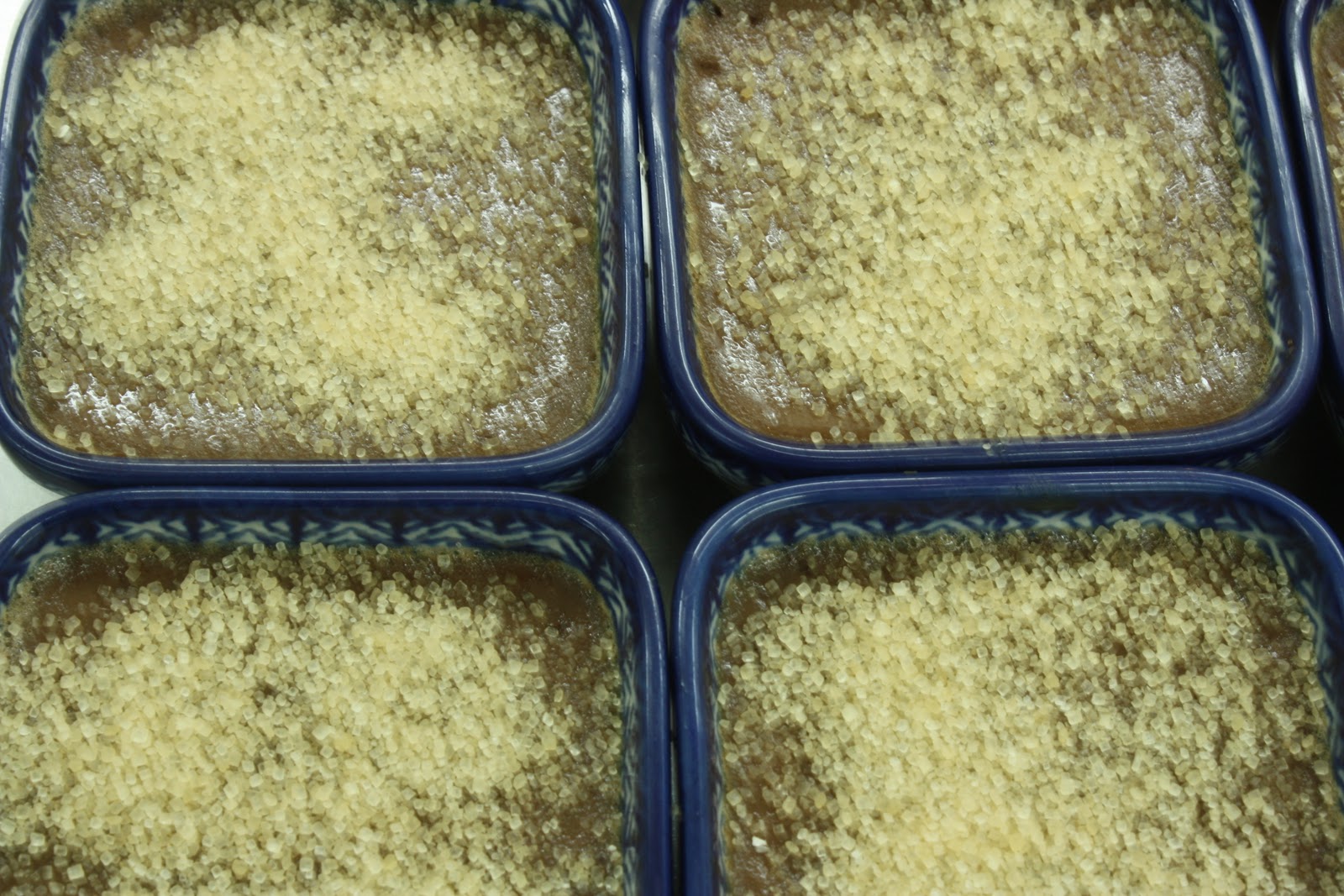 - Sprinkle the top of the custard with a thin layer of turbinado sugar. Melt and caramelize the sugar with a torch or under the broiler.