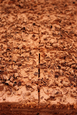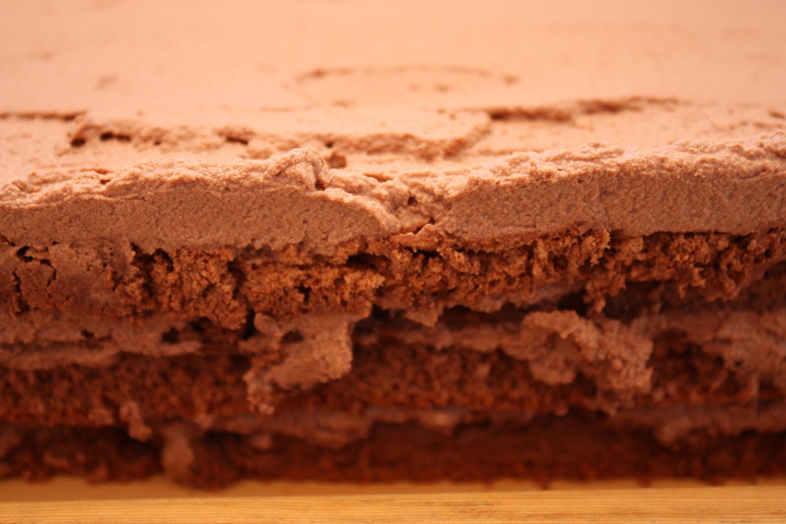 This cake is so simple that I kept double-checking the ingredient list; it seemed like I must be forgetting something. I melted chocolate and while that was cooling, I beat the egg yolks with sugar until thick and fluffy. The chocolate was combine with the yolks, and the last step was to fold in a cloud of meringue. This batter is baked in two sheet pans; think of it as a very thin chocolate souffle.