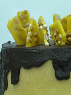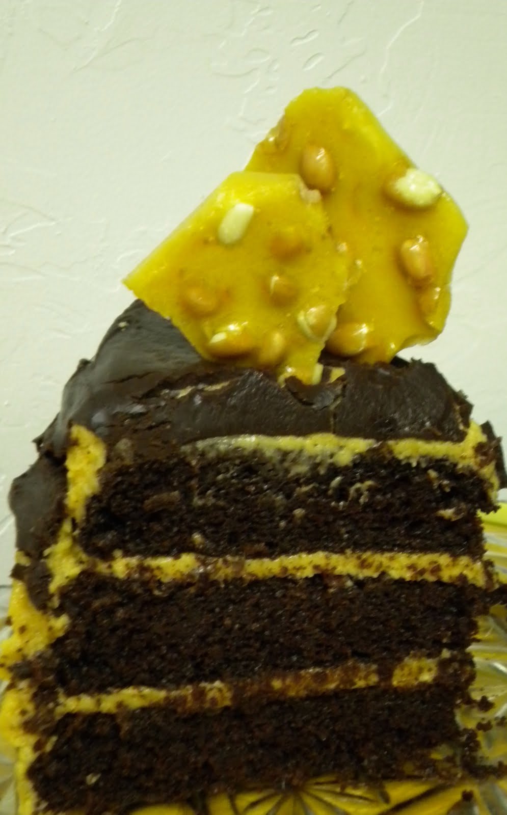The recipes for all the components are listed below. To assemble the finished product, frost the frozen cake layers. Let sit in the fridge until ready for the ganache. Pour ganache (that’s not hot) over the center of the cake and help it to the edges and over the side. Place in fridge to set. Just before serving, stick in peanut brittle pieces.