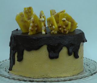 Our celebration was scheduled for just a couple of days after I returned from vacation, so I made the cakes and the frosting before I left and just put them in the freezer. Upon my return, I made the peanut brittle and chocolate ganache, assembled the cake (except for the peanut brittle; I was saving that for the last minute).