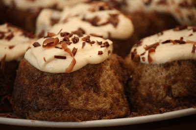 I made the little chiffon cakes in silicon cupcake pans. The fluffy batter is flavored with a little instant espresso. After baking, they’re brushed with a Kahlua syrup, also flavored with instant espresso.