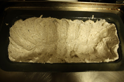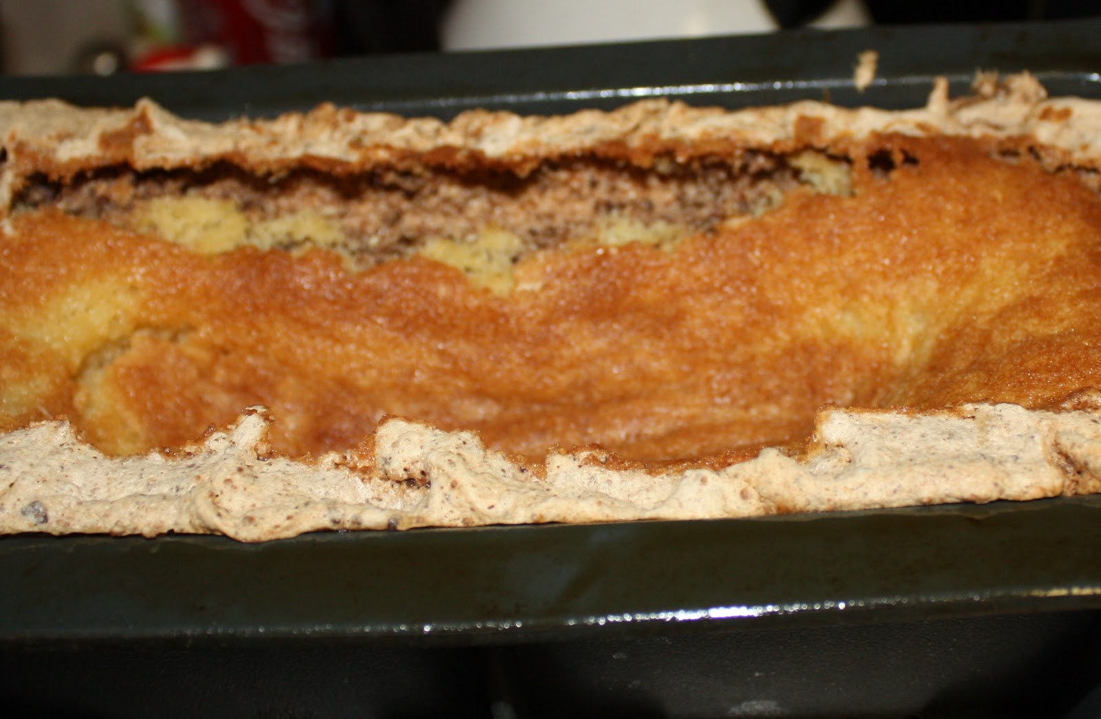 The cake began with a dacquoise, a meringue dressed up with ground nuts (I used almonds) and chocolate. The dacquoise is spread in a loaf pan. Marie told us that dacqoise comes from the French town of Dax, known for it’s spa. That was especially interesting to us because Lisa’s dog is named Dax.