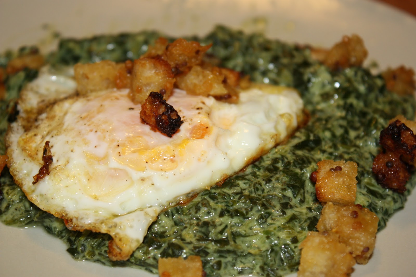 - Divide spinach between two plates, top with eggs, and sprinkle with mustard croutons.