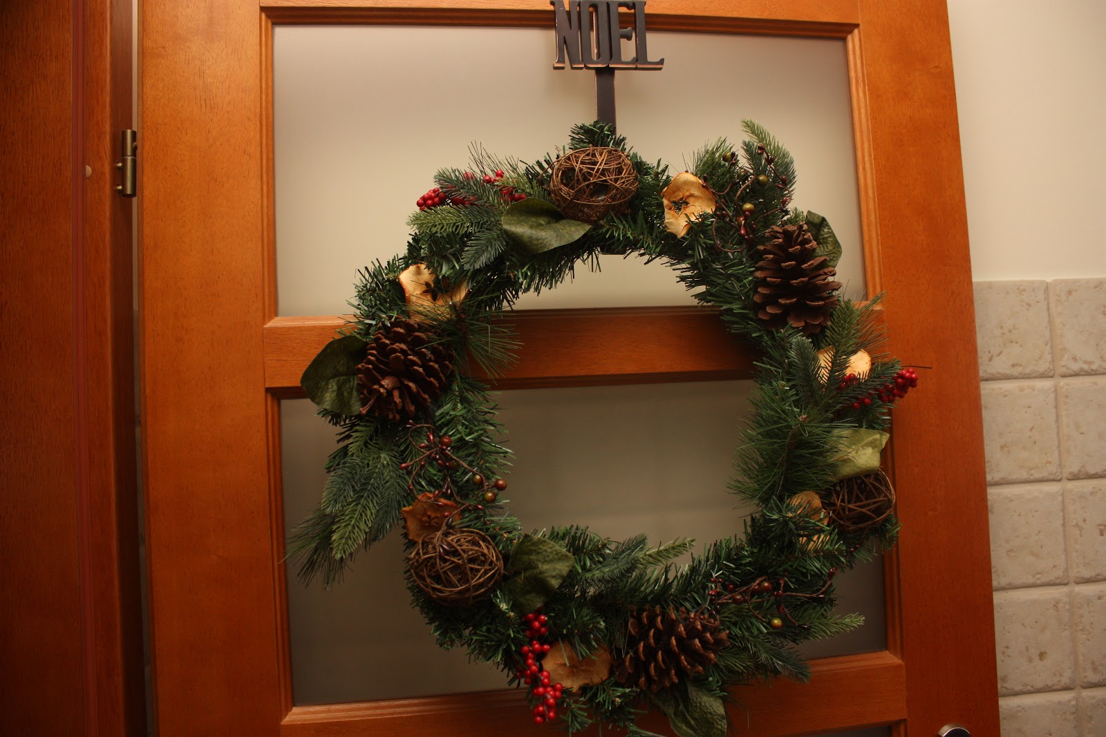 | Our front door is too thick for the wreath holder; we’ll see it more on the kitchen door anyway |