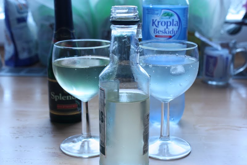 We mixed the syrup with sparking water and sparkling wine. Ed and I both thought both tasted great, very refreshing. This glass probably holds just over half a cup. Add the syrup to taste. Ed’s thinking 1 tablespoon for a manly mix, 2 or more might make it a little girlie. It made our very cheap, not all that drinkable sparkling wine very tasty!