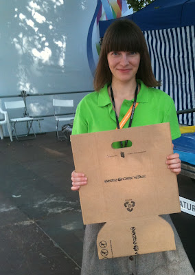 How’s this for a chair? This design was the winner chosen in a contest to come up with “green” seating for the Euro fan zones. The cardboard stool folds up flat like a box, is very strong, and recyclable The only downside – it’s not water proof.