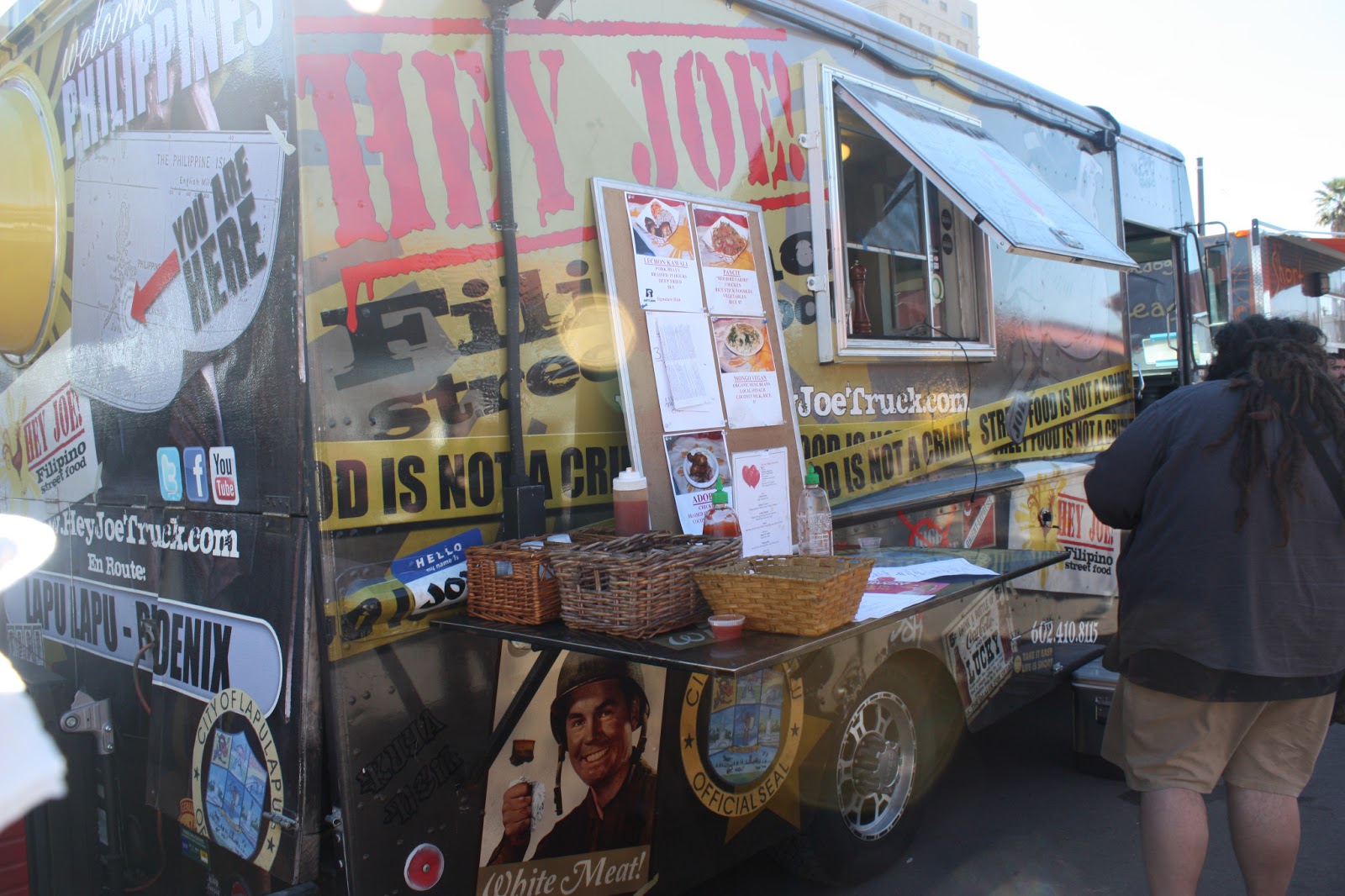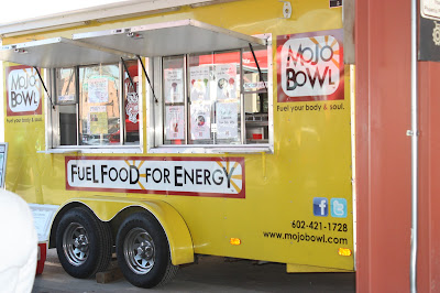It was just three years ago, that I wrote about my first experience with a gourmet food truck. The World Fare Bus, a double-decker, pulled up outside a food blogger workshop I was attending in Los Angles. The trend has now arrived in Arizona. Today, my daughter and I hopped on the light rail to downtown Phoenix for Food Truck Friday at the Phoenix Public Market. The Market, which consists of several weekly open air (parking lot) events, is part of a nonprofit that emphasizes eating local, healthy food. On Fridays, from 11 to 1:30, about a dozen food truck are in the parking lot, complete with a DJ from a local radio station.