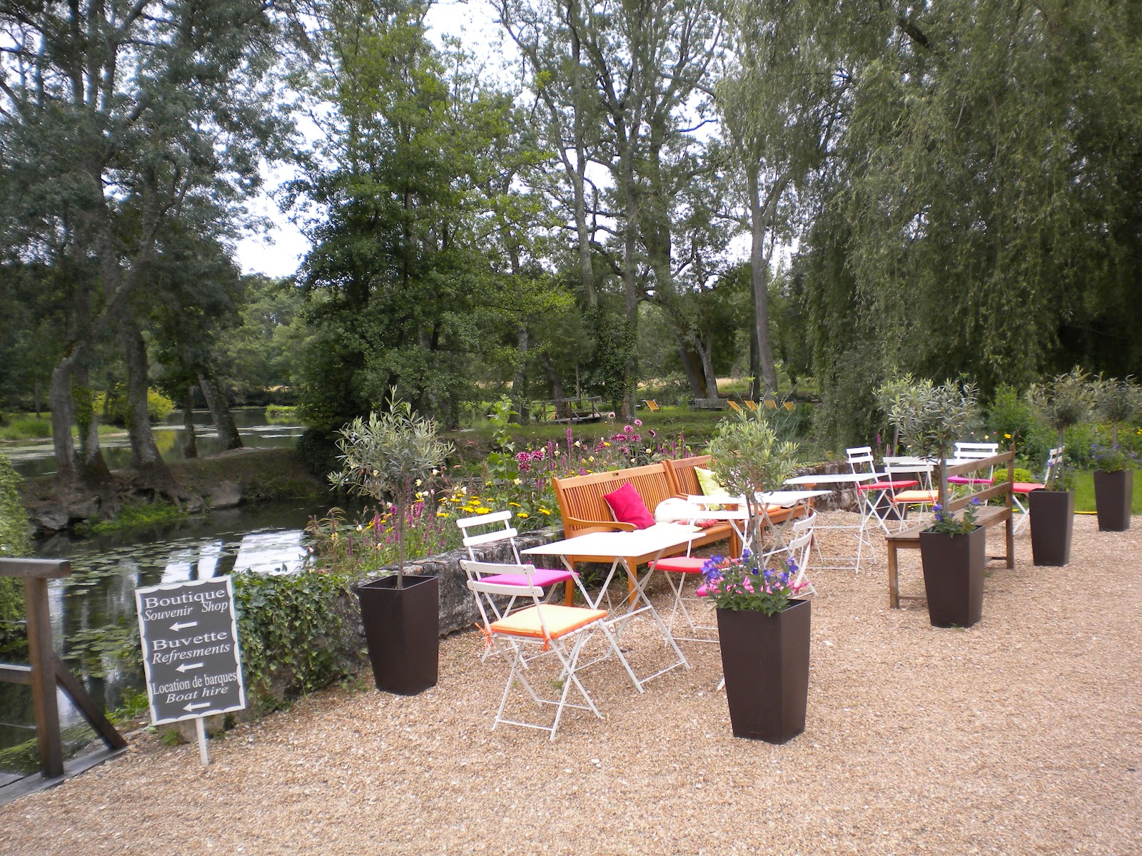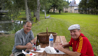 Bill put together a wonderful picnic for us: sandwiches made with rilette on baguette as well as Camembert sandwiches, fresh peaches and tomatoes, a fine Chinon wine, and a bottle of water. We enjoyed this meal at a picnic table along the water on the l’Isette grounds, and it will become the standard by which all future picnic lunches are judged.