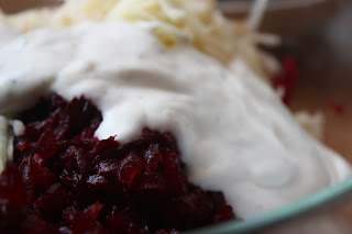 I always like to show you a photo of the finished dish, but this time, you’re getting the dish in progress. I have come to love beets while living in Poland. I can’t believe that I’d only had them once before moving here. The only problem is the color; they turn everything they touch a bright fuschia; there isn’t much definition to lend its self to photography. If you remember to start roasting your beets ahead of time, this is quick and easy to put together – a dish that I’ll repeat often.