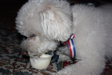 Our somewhat pampered dog, Benson, loves frosty paws, but they’re so expensive. I realized that I could make my own for pennies. The basic ingredient (in my version) is plain yogurt. I had planned to stir in a little tuna or salmon, but couldn’t find any in the pantry, so I used dry dog food and oats. Ben didn’t seem to mind the substitution. You could use anything that’s safe for dogs to eat.