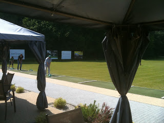 As for the aesthetics, the hotel is just outside of town, near a lake. The driving range is bordered by forest on one side and wheat fields on the other two. Behind the hitting area, is a row of gazebos complete with tables and chairs. The wait staff from the hotel restaurant will check to see if you want anything, mineral water, coffee, salad. It’s a beautiful setting to enjoy a snack, read a book, or watch the golfers.