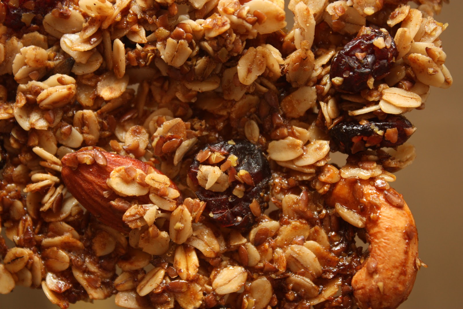 - Mix together the oats, nuts, fruit, flax, salt, cinnamon, and ginger