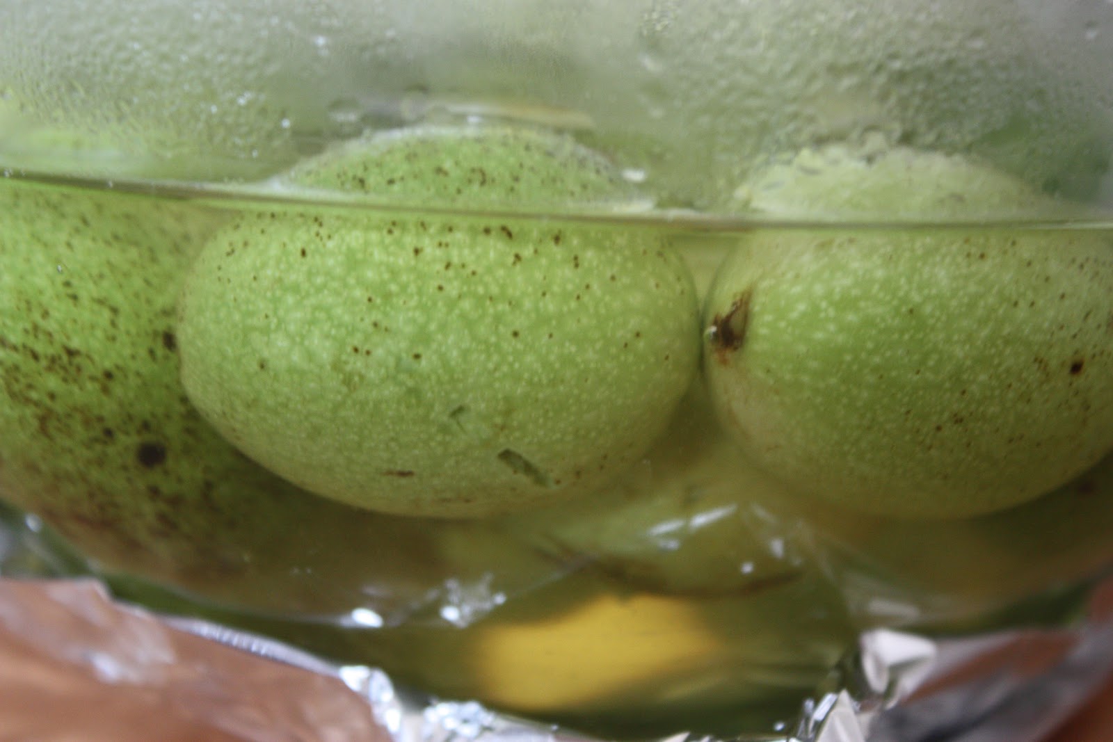 It’s been a mild summer, so it was late June before Greg popped round with the green walnuts, which look more like a lime than what you’re used to seeing in the nut bowl at Christmas.