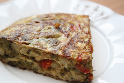 Tortilla is a Spanish favorite – usually a potato omelet (no similarity to the Mexican tortillas). I wanted to omit the potatoes, which taste terrific, but add a lot of carbohydrates to the dish. So in their place, I’ve added broccoli, cauliflower, and red bell pepper. I usually serve tortilla in wedges for dinner (or breakfast) or 1-inch squares for an appetizer. We ate this plain for breakfast, but you could also top with salsa.