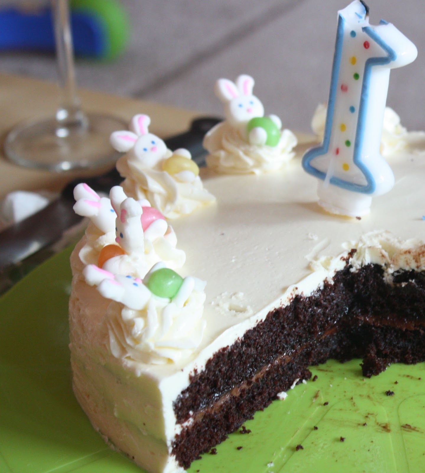 Our neighbors were planning to celebrate their daughter’s first birthday with extended family over Easter. That didn’t work out, but we did get to join them for a smaller party last weekend. Since only four of us would be eating cake at this belated birthday party, I decorated one of the three layers I baked. I hope to turn the other two into petit fours soon. (Keep your fingers crossed for me!)