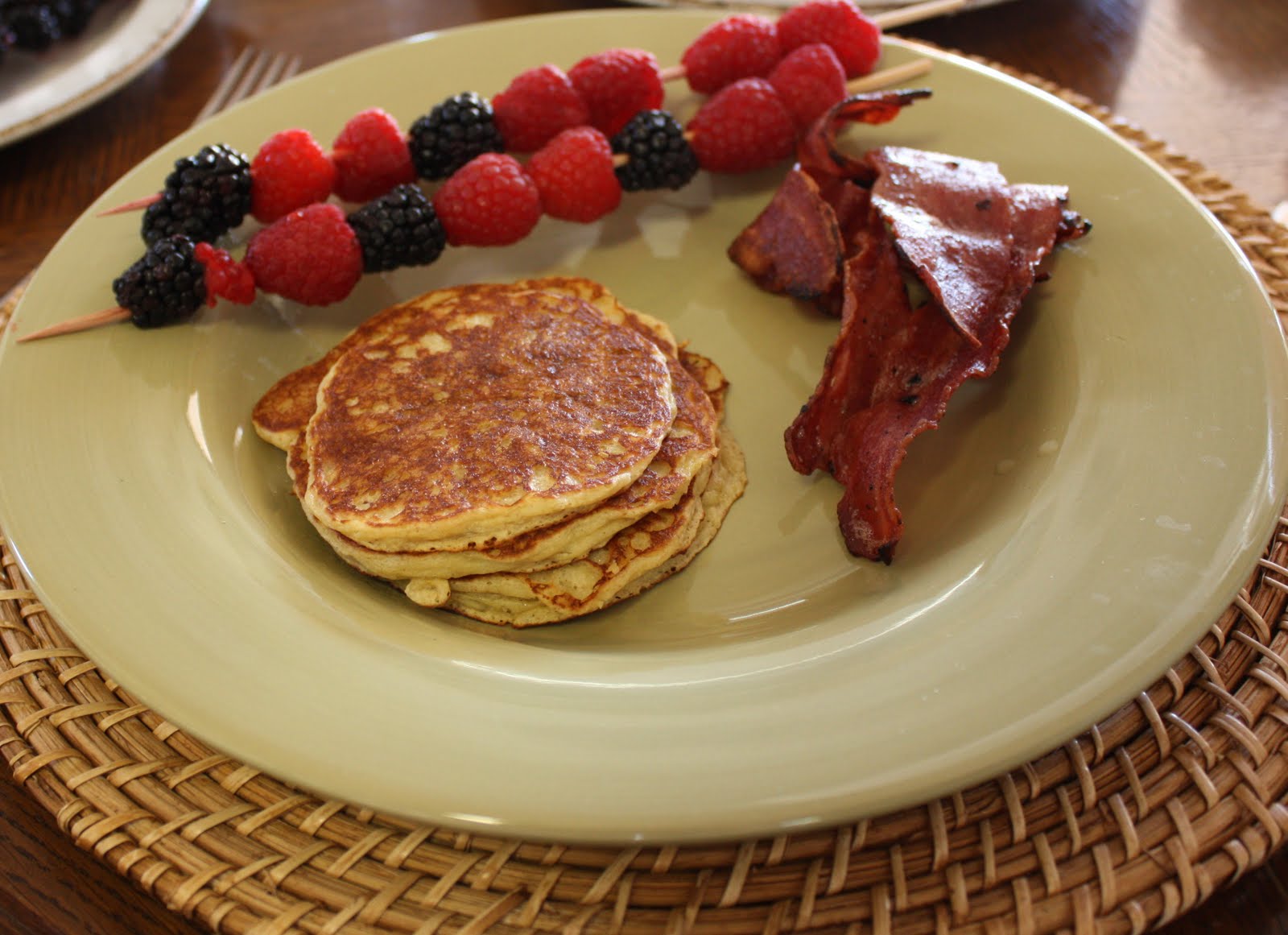 i like how you put the raspberries in sticks! 🙂 Pancakes with bacons? Hmm..i’ve not tried that combo before..i’ve always had my pancakes with honey and butter. got to try this combo!