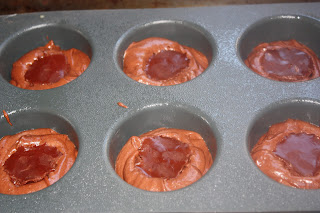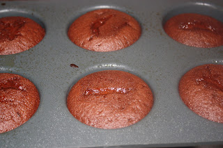 I’ve tasted lava cakes before, but this is my first attempt at making them.  My silicon cupcake pan may be larger than 4 ounces.  I made six rather than seven.  I think that maybe I should have made only six ganache balls rather than nine, just to keep the proportion correct.   Molding the ganache in a plastic wrap lined egg carton was a great trick.