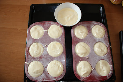 I haven’t found a baking spray yet, so I buttered the cups and dusted with flour. It was the usual two step process with a fluffy meringue folded in for a light as air, orange scented batter.