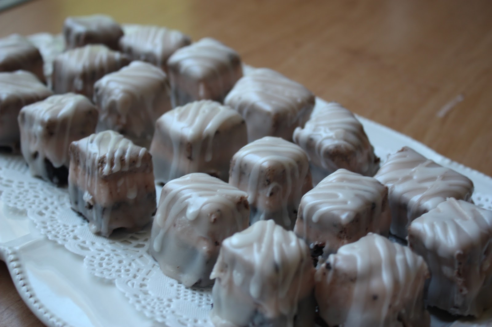 Well, friends, to be honest with you, I have to give you the bad with the good, successes and failures. I had some leftover chocolate cake in the freezer, and I’ve been wanting to try making petit fours. I’ve always loved the perfect look of these miniature cakes. Remember the little four-pack that was always part of Hickory Farms gifts boxes at Christmas? I have a new found respect for those folks at Hickory Farms.