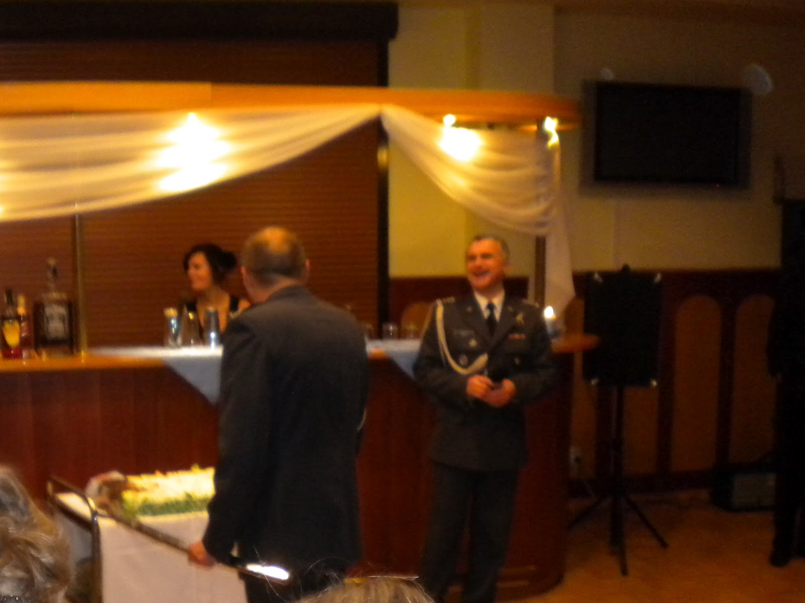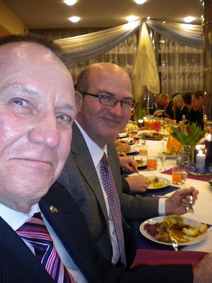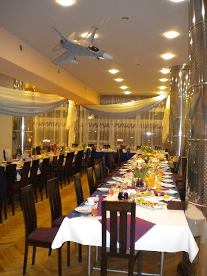 Ed got to attend the ball last year, before I moved to Poland, so I was excited to be here for the 2011 bash. The ball is held at a military recreation facility northwest of Poznan, just outside of town really. The banquet hall was beautifully decorated, complete with F-16s overhead. we arrived about 8:30 PM by cab. Drunk drinking laws are so strict here, that you don’t drink anything if you have to drive. Knowing the evening would include more than one toast with the a shot of vodka, a cab seemed wise. The driver had a little trouble finding the place, even with the front seat passenger giving directions from his phone gps. We worried about a cabbie being able to find the location on his own when we were ready to leave, so we asked this driver to return for us at half past midnight. He agreed, and we crossed our fingers.