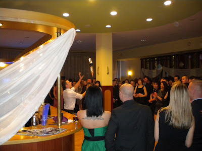 The next bit of entertainment was our friend Remi, who put on a flair demonstration. Flair if you’re not up on the term is the juggling and balancing of bottles, shakers, and glasses while preparing a drink. Remi and Agnieszka prepared beautiful cocktails.