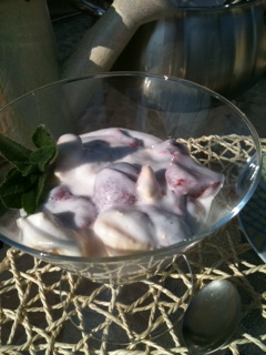 With the sausages, we had salad with greens and herbs from the garden, beet root with horseradish (traditional for Easter breakfast – very tasty), bread, and for dessert. . . strawberries, with little meringues (beza) in whipped cream.