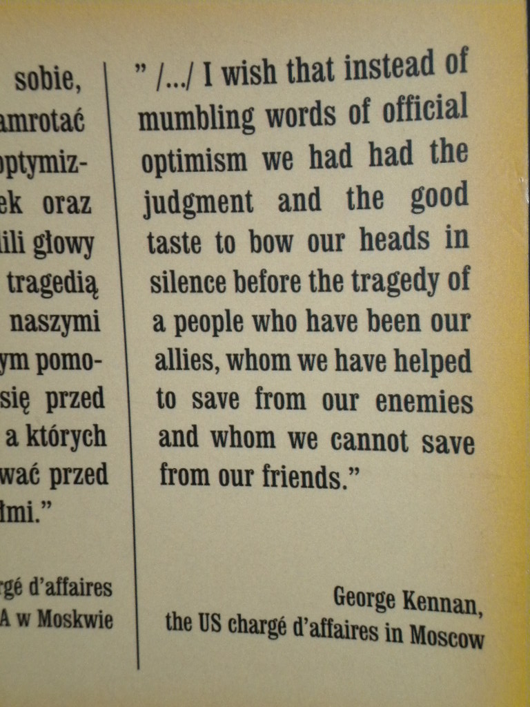 “. . . I wish that instead of mumbling words of official optimism we had the good taste to bow our head in silence before the tragedy of a people who have been our allies, whom we have helped to save from our enemies and whom we cannot save from our friends.”
