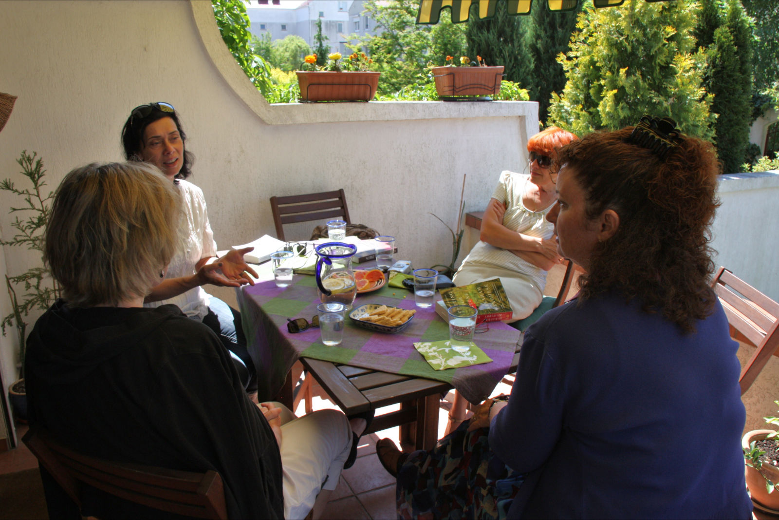 This week was my first meeting of the PILC Book Club. Yvonne, our hostess, snapped this photo as we gathered in her back yard to discuss the books everyone had read. Isn’t this a beautiful setting? We moved indoors to enjoy the meal Yvonne had prepared for us, a salad, the delicious Swedish version of empanadas (obviously, I am more familiar with Mexican food than Scandinavian dishes) and a rhubarb pie with ice cream.