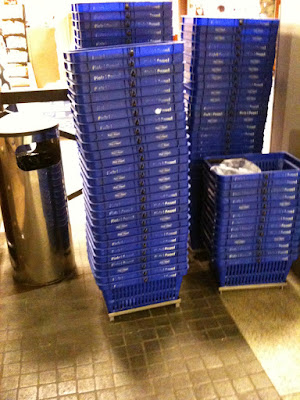 I’m usually walking home, carrying my groceries, so I use the little baskets when grocery shopping. It’s a good reminder not to buy too much and to mind the weight. We’ve only used a shopping cart one time, so I’m a little sketchy on the details. I thought you might find it interesting, nevertheless.