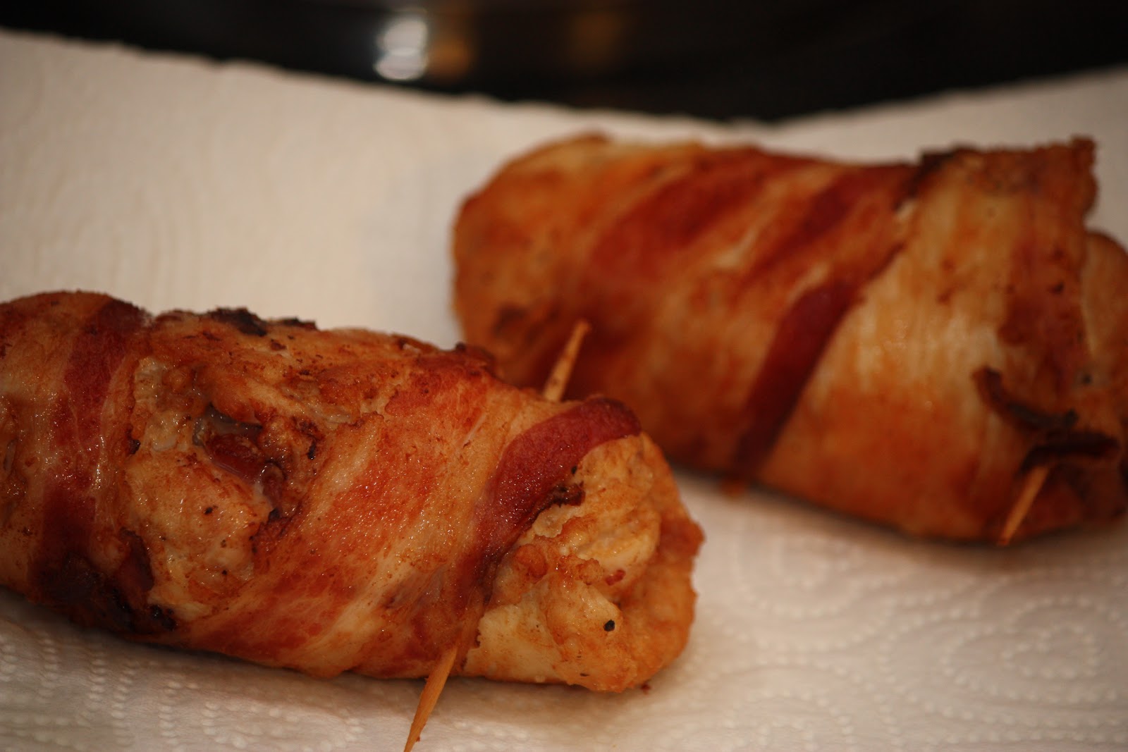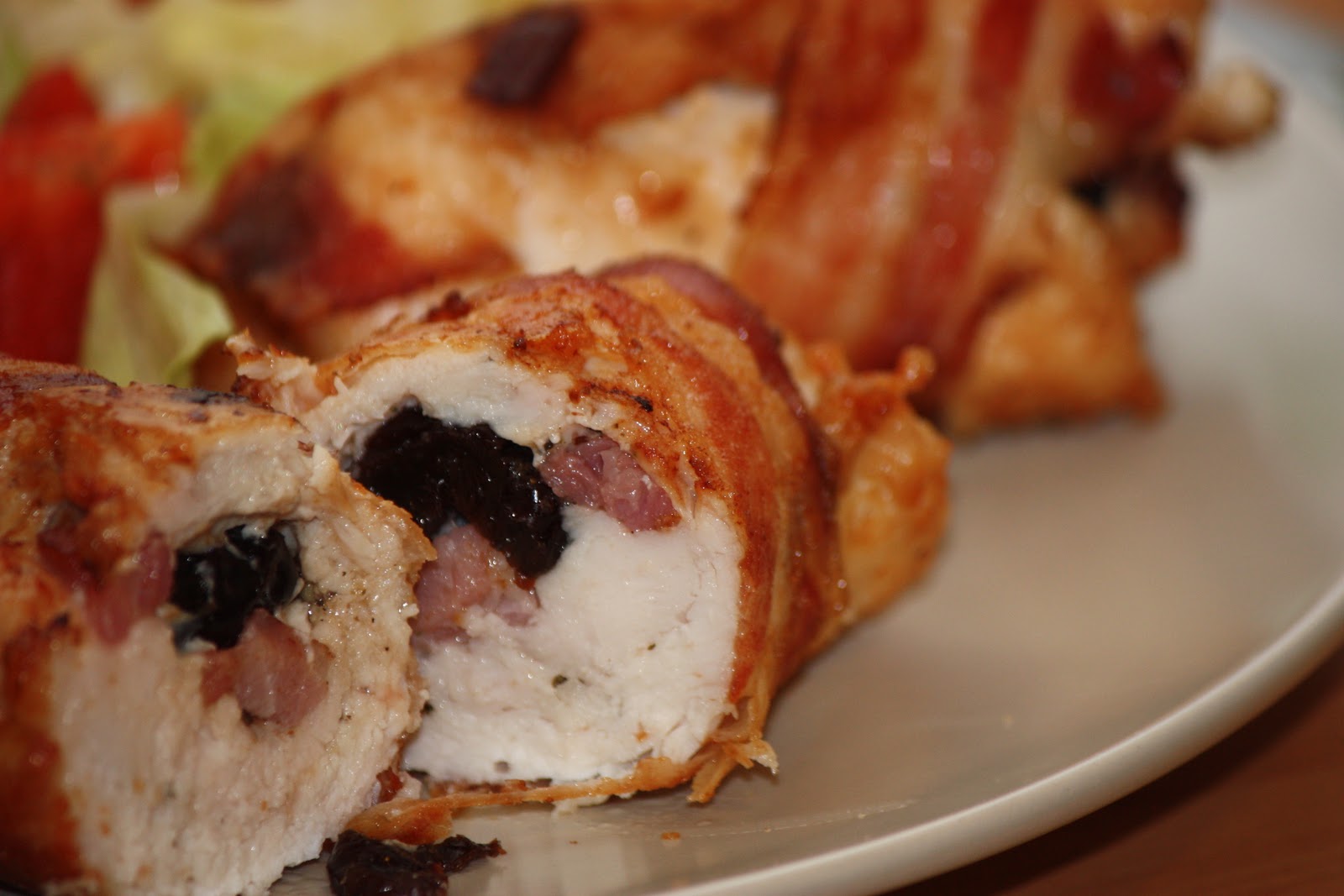 - Roll the chicken breast up around the filing, wrap with a slice of bacon and secure with toothpicks