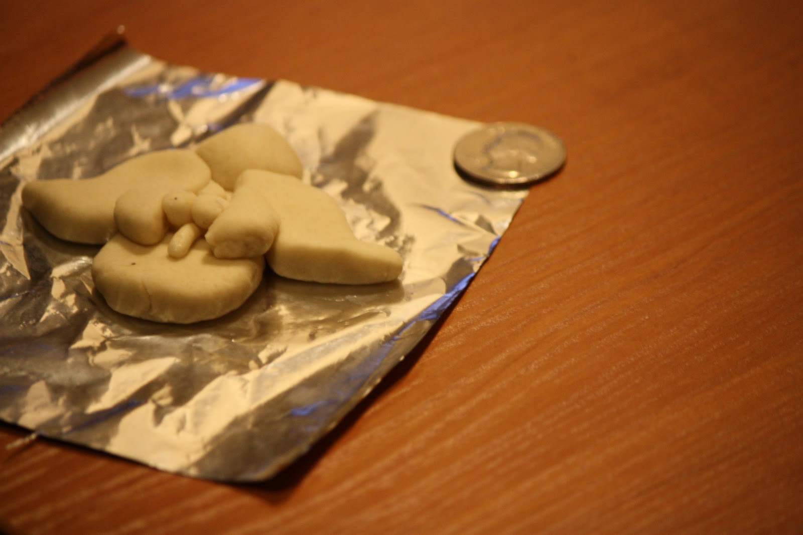 - Use a small (6 inch square) piece of aluminum foil as your assembly/baking tray for your ornaments