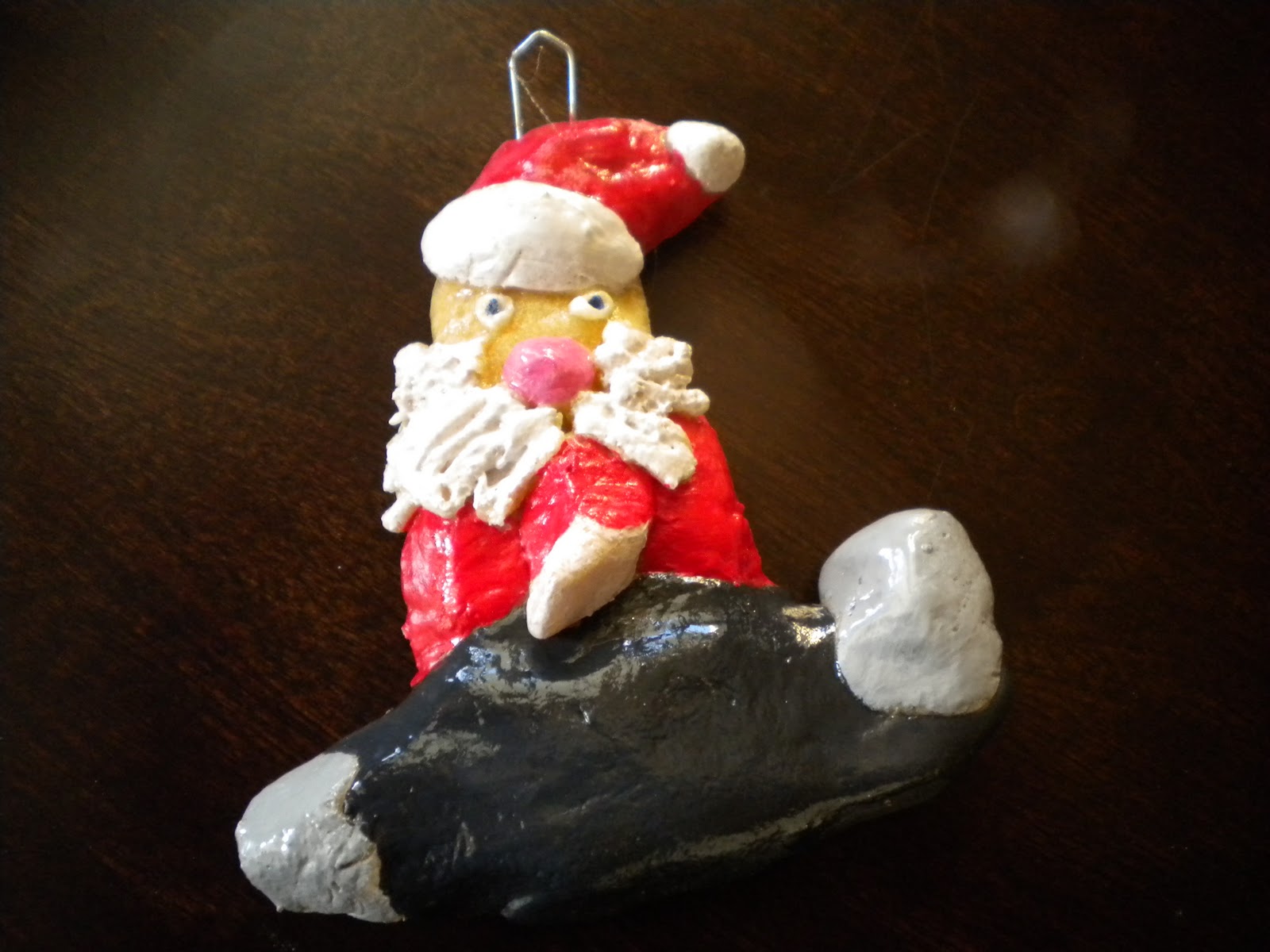 There are a lot of dogs in our extended family. I think they all have their own ornament – a puffy 3D dog bone shape with the name spelled out (use the garlic press to get long straight bits to make letters) on the bone with a bit of holly. We leave the bone unpainted and paint the name (in red or green) and the holly.