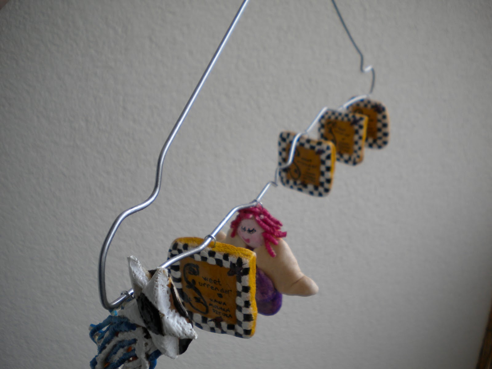 | I opened up a wire hanger, putting ridges along the bottom to make a drying rack. It allows you to spray both sides at once. |