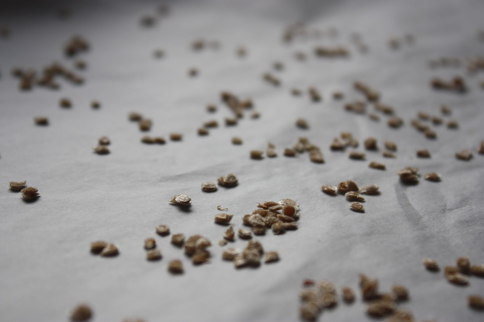 The final step was to spread out the seeds on a piece of parchment paper and put them in the oven for about 24 hours with just the light bulb on.  As they dried, I rubbed clumps of seeds between my fingers to separate them.
