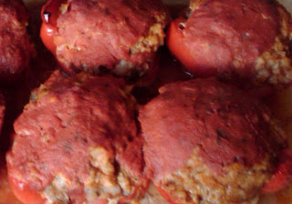 Gently combine first 7 ingredients with 1/2 of the tomato sauce. Fill the pepper halves and place in a baking dish. Top with remaining tomato sauce. (Can be prepared ahead and refrigerated at this point. Add 20 minutes to baking time if refrigerating.) Bake at 350 degrees for 45 minutes.