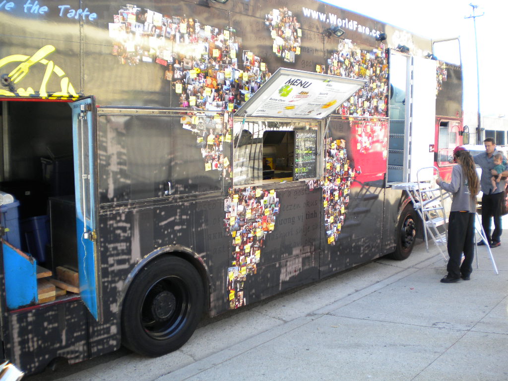 The room was buzzing as the food blogger seminar broke up last weekend in Los Angeles – the World Fare Bus was going to be outside! Apparently, gourmet food trucks are all the rage in LA, a trend that hasn’t made it to Arizona yet. Well known chefs are sending their offerings out to the city in the the sort of chow wagon normally found on outside factories or at construction sites.