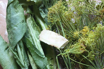 I bought the dill flower and some little cukes last night. I thought I would need to run to the little shop nearby for a piece of horseradish today. I shouldn’t have been surprised, but when I opened the package of dill, I saw that it also contained a piece of horseradish and some leaves – a pickle making kit, similar to the packages of soup veggies in every produce section.