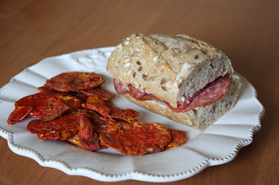 In the last week, we’ve noticed these tomato chips in several Polish supermarkets. I’m wondering if they’ve already appeared in the states. The ingredients are simple, tomato, basil, oregano – no oil, no salt, no preservatives. They’re very crisp, giving you a satisfying, guilt free crunch as a side to your sandwich, or even in your sandwich.