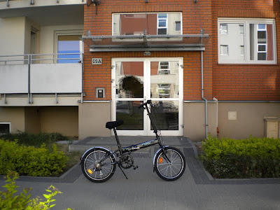 This is my new travel bike. The crossbar hinges, allowing the bike to fold in half. The handlebars and seat are made for quick and easy adjustment. (I think it will be perfect to toss in the trunk of a car when we’re back in Tucson. I’ll be able to ride the paths along the Rillito or Santa Cruz without having to ride through town to get there.) In Poland, I’ve been riding it from our apartment around the nearby lake and back.