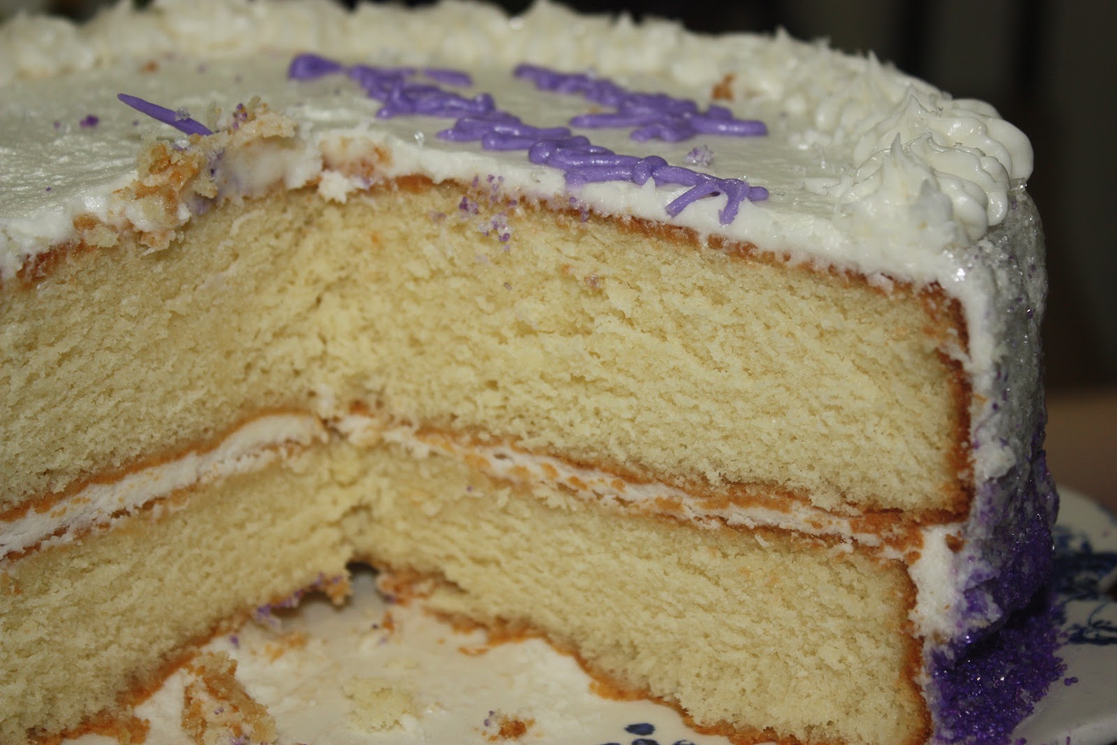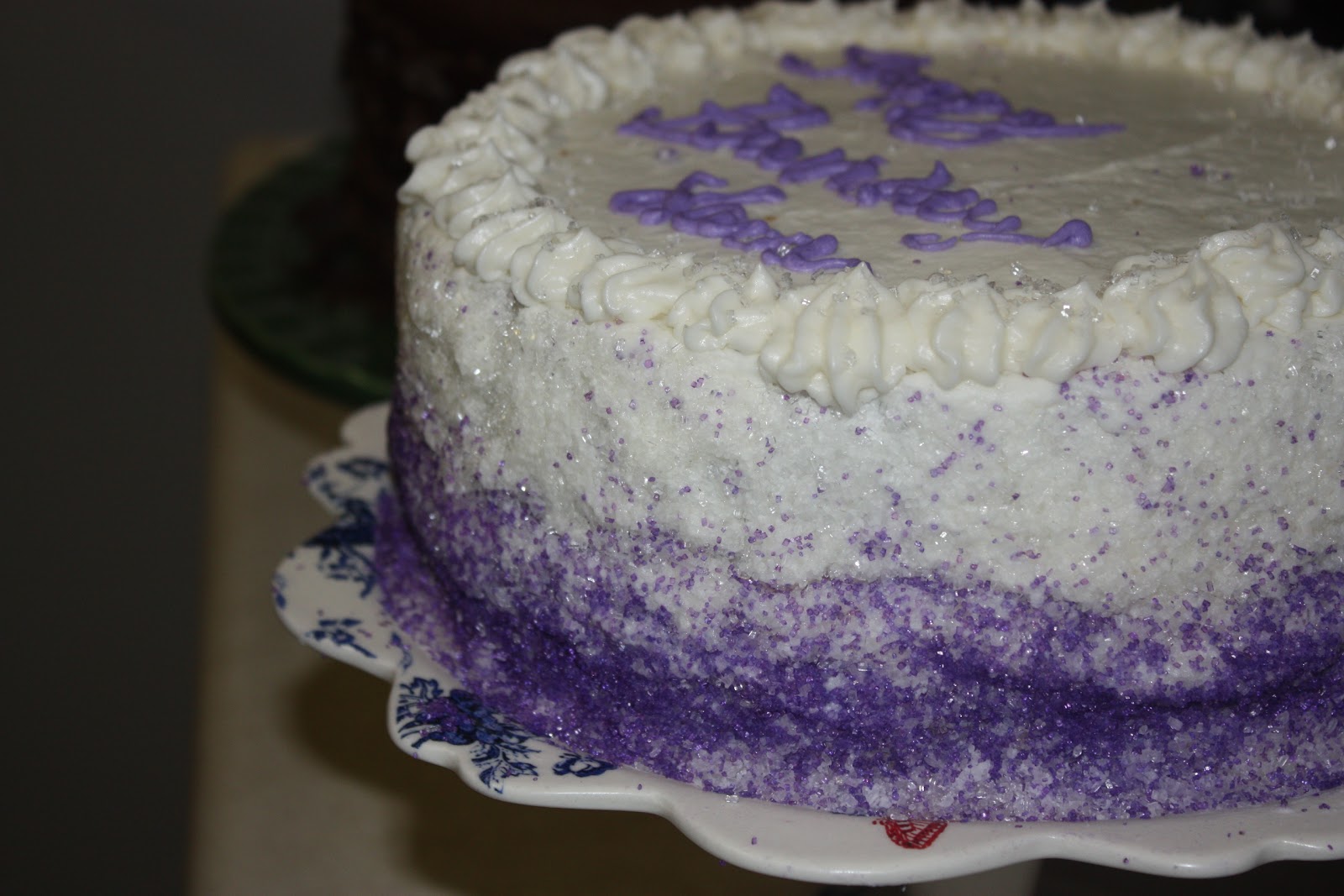 Magnolia’s Vanilla Cake with Vanilla Buttercream and purple sprinkles on the side in an ombre effect. This was our daughter’s request for her birthday. Fortunately, I watch Project Runway, so I was familiar with the ombre (graduated color) concept. I mixed purple and white sugar crystals with varying the amounts, but applying them to the side of the cake was so difficult that I’ll need an air brush before I try to get this look again. . . oh well, I tried, and I know she appreciated the effort.
