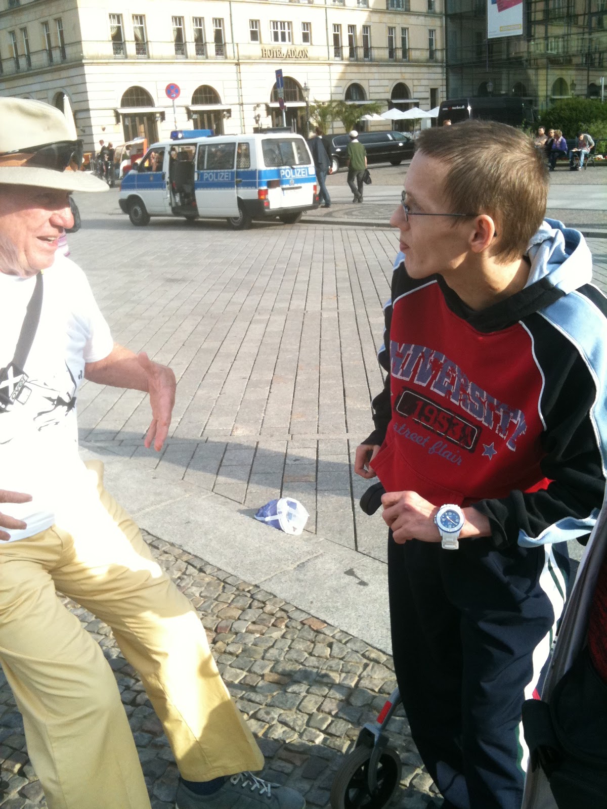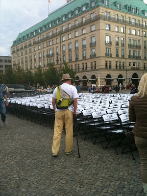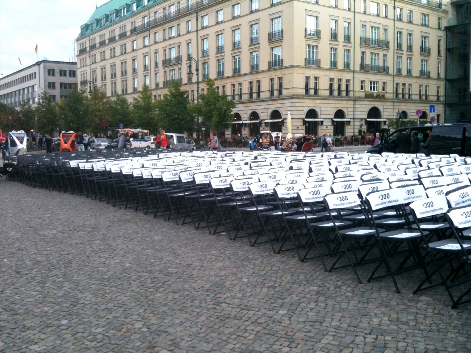 | When we arrived at the Brandenburg Gate, we found the team setting up chairs, 600 of them. They’re a visual display, not meant for sitting. |